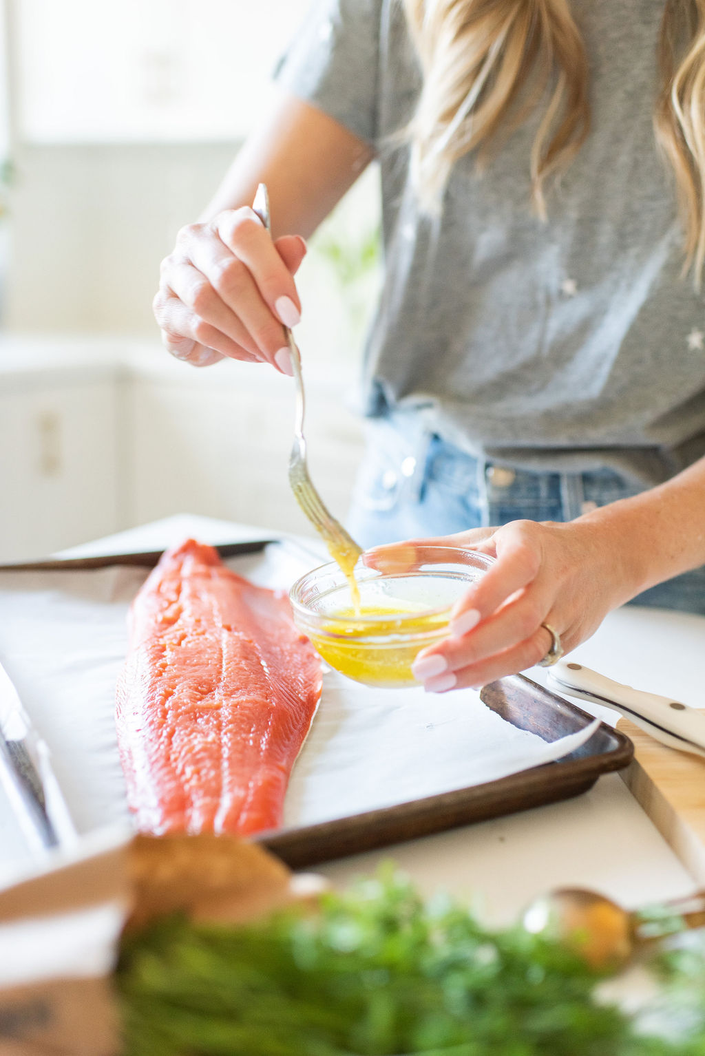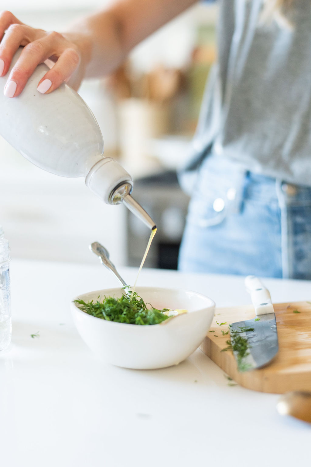 I like to keep the preparation simple with some avocado or olive oil, fresh lemon juice, Dijon, dill, salt and pepper. Bake at 400 for 15 minutes or less (careful to not overcook salmon as it gets dry). Make this dill chive sauce as a dip, side, or marinade – it tastes so good!