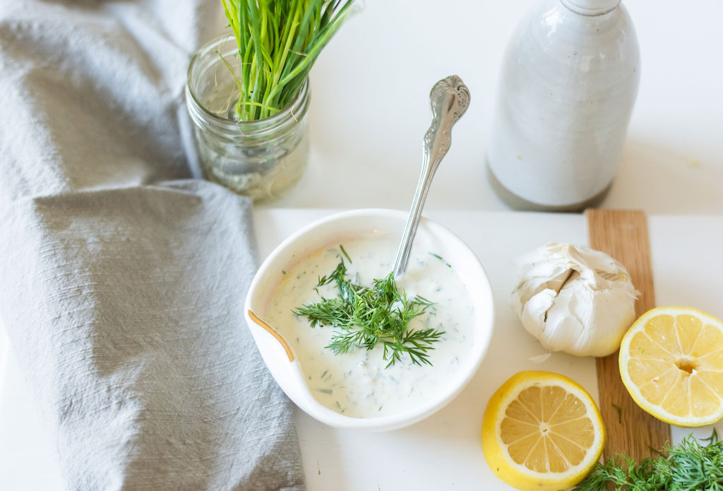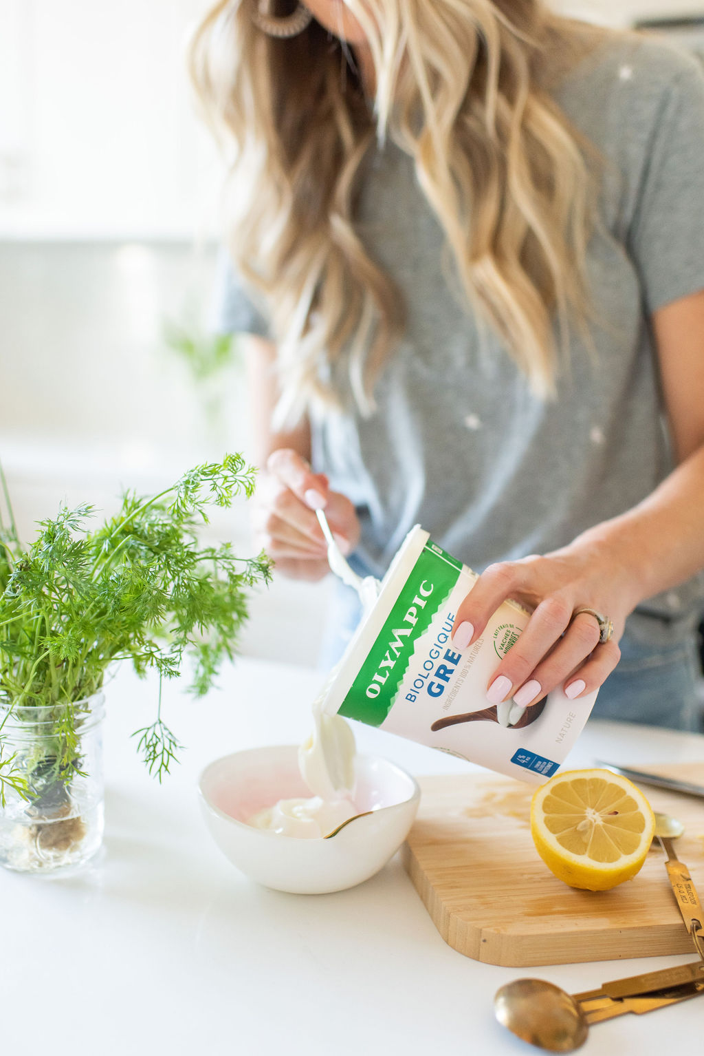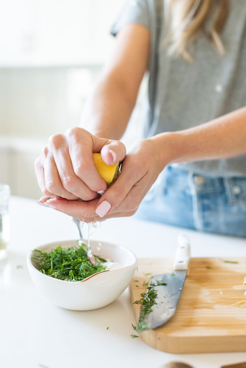 03. In a medium bowl, combine the sour cream, Greek yogurt, lemon juice, dill, chives, garlic and salt. Whisk well to combine.