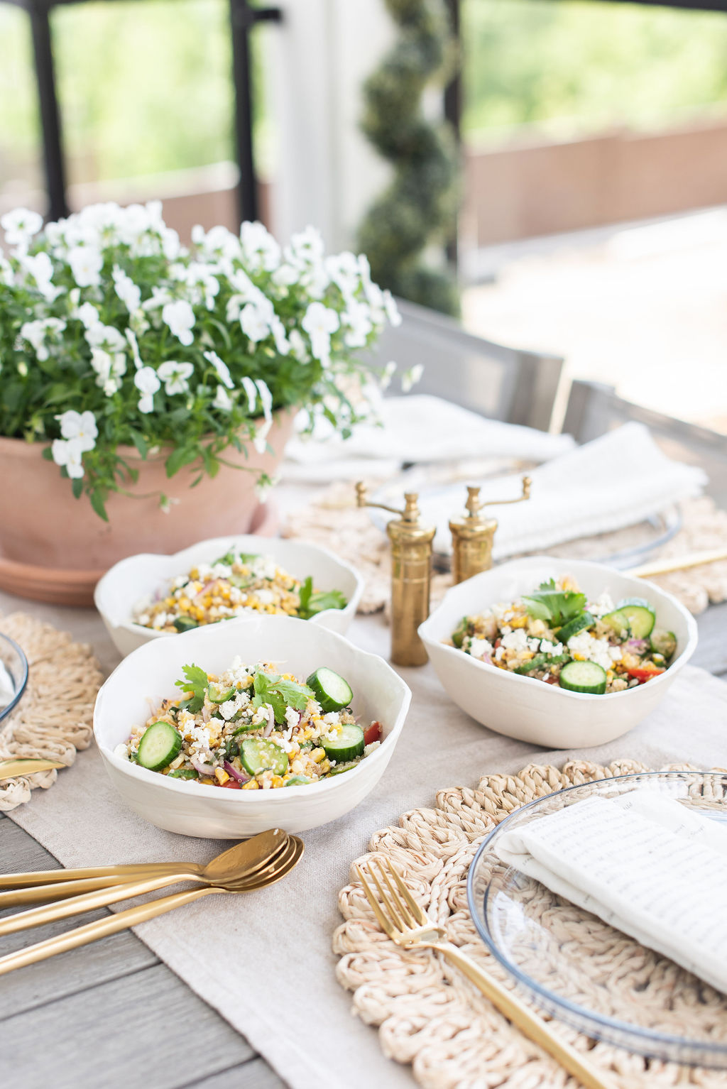 04. While the corn are being cooled, stir the cucumber, basil, onion and tomatoes into the cooked quinoa bowl.