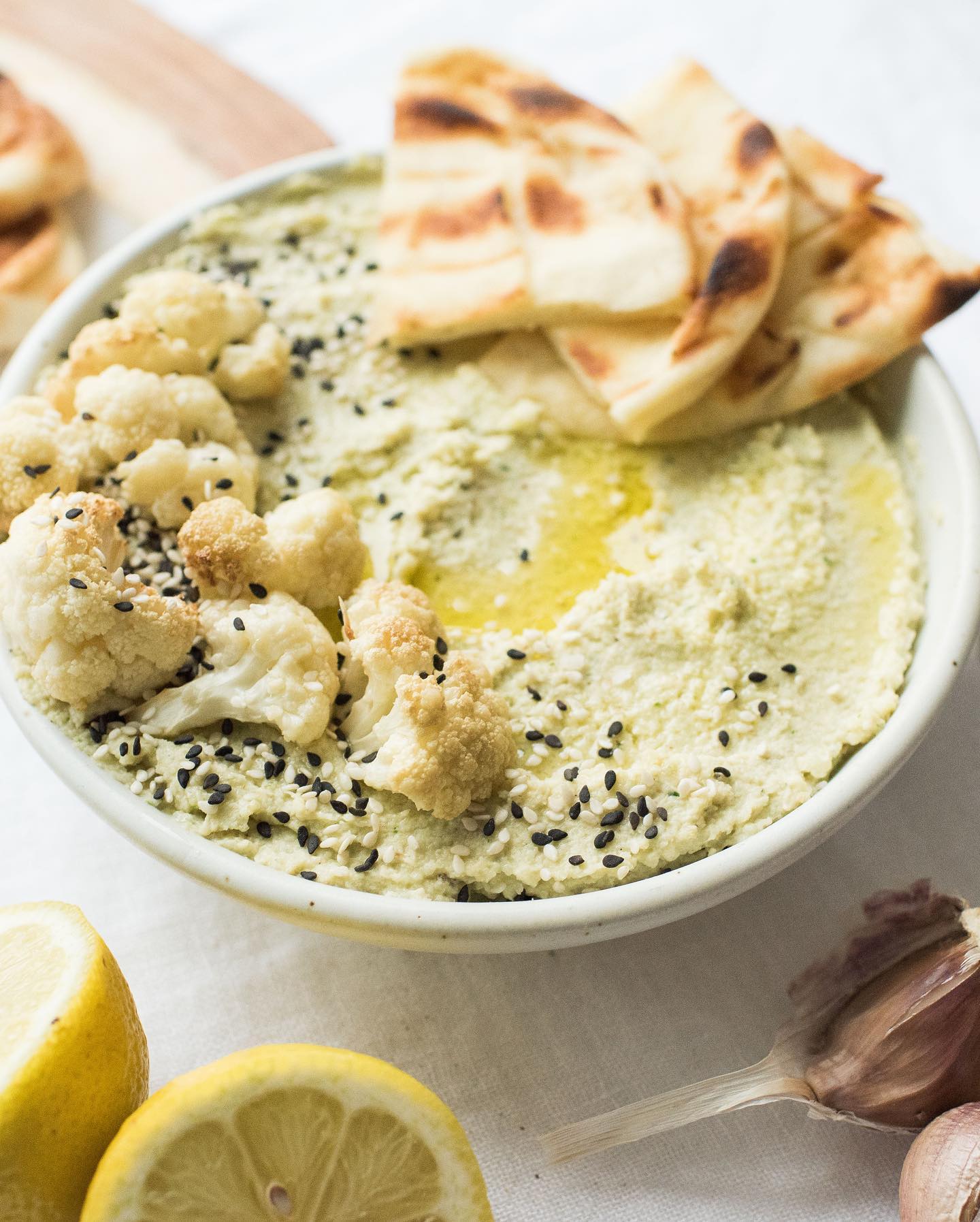 This mild-flavoured cruciferous veg contains numerous beneficial compounds for healthy hormone balance, cancer protection and is a powerful source of nutrition containing vitamin C, fiber, potassium, phosphorous and B vitamins. Here’s a little fun food trivia for you- the cauliflower is white because it’s ribbed, coarse green leaves protect the curd from sunlight, thereby impeding the development of chlorophyll. Cool hey?! I normally roast cauliflower at 400 with a drizzle of oil, sea salt and a generous handful of hemp seeds. Make sure to leave enough space in between each floret so they roast/carmelize rather than steam. Once cooked they taste oh so good with a sprinkle of Parmesan. In my cookbook I share a few delicious recipes for cauliflower including a creamy soup, “Alfredo” style pasta sauce, and a personal favorite braised with tomatoes! Literally delicious!!! I’m sharing a garlic, lemony cauliflower hummus with you here- because I feel we could use a bit of comfort yet nourishing ways to snack!