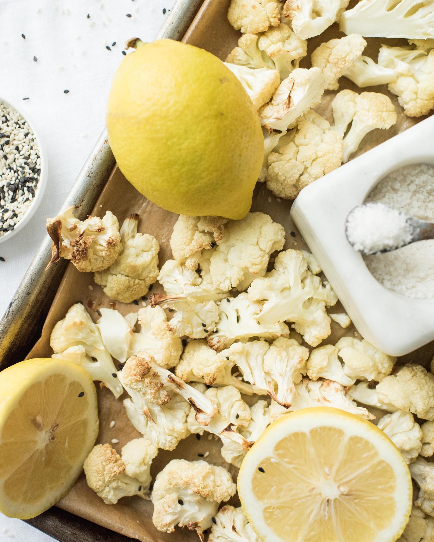 03. Set aside a small handful of roasted cauliflower florets before transferring remaining cauliflower to a high speed blender or food processor. Add tahini, extra virgin olive oil, lemon juice, garlic clove, salt and cumin. Blend until creamy and smooth. Adjust seasoning to taste with additional lemon juice, salt and olive oil. Transfer to a serving bowl and garnish with sesame seeds, parsley and reserved cauliflower florets.
